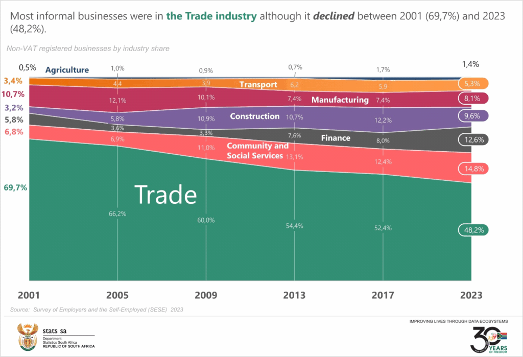 South Africa’s informal sector has mostly been about trade for a long time, but that’s starting to change. Back in 2001, about 70% of informal businesses were in trade, but by 2023, that number fell to around 48%. While trade is still the biggest part of the informal economy, other sectors like services, finance, construction, transport, and agriculture are growing. This shows that informal businesses are shifting their focus to different industries.